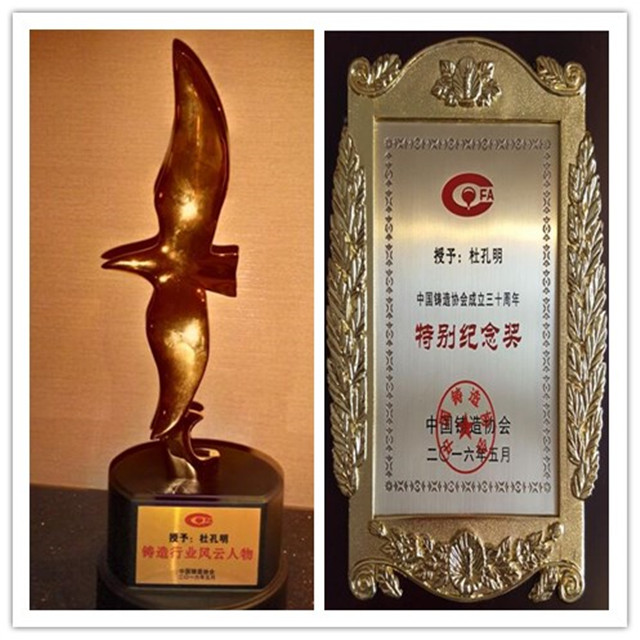 同時,在第二屆中國鑄造節行業表彰會中,杜孔明總經理榮獲“鑄造行業風云人物”、“中國鑄造協會成立三十周年特別紀念獎”和“奉獻鑄造行業三十年工作者”三項榮譽稱號。